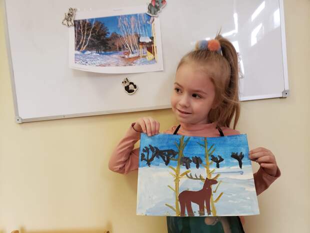 Готовые работы получились очень милыми, ведь воспитанники, которые ходят в частный детский сад Классическое образование, нарисовали лосей около домиков и на лесных опушках. Квалифицированный воспитатель помогала в рисовании, давала рекомендации, советовала с чего начать картину и какую цветовую гамму выбрать для изображения природы, отвечала на тематические вопросы от любопытной детворы.